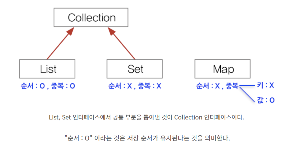 컬렉션 프레임웍에서는 컬렉션데이터 그룹을 크게 3가지 타입이 존재한다고 인식하고 각 컬렉션을 다루는데 필요한 기능을 가진 3개의 인터페이스(List, Set, Map)을 정의하였다.