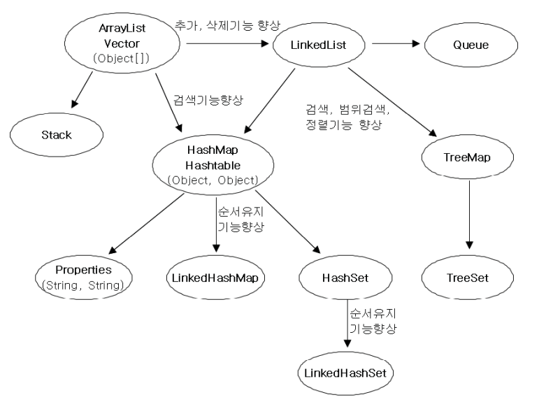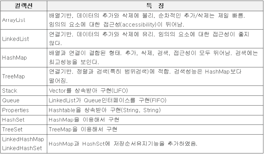 - Vector와 Hashtable과 같은 구 버전은 자체적으로 동기화가 처리되어 있는데, 멀티쓰레드 프로그래밍이 아닌 경우에는 불필요한 기능이 되어 성능을 떨어뜨리는 요인이 된다.