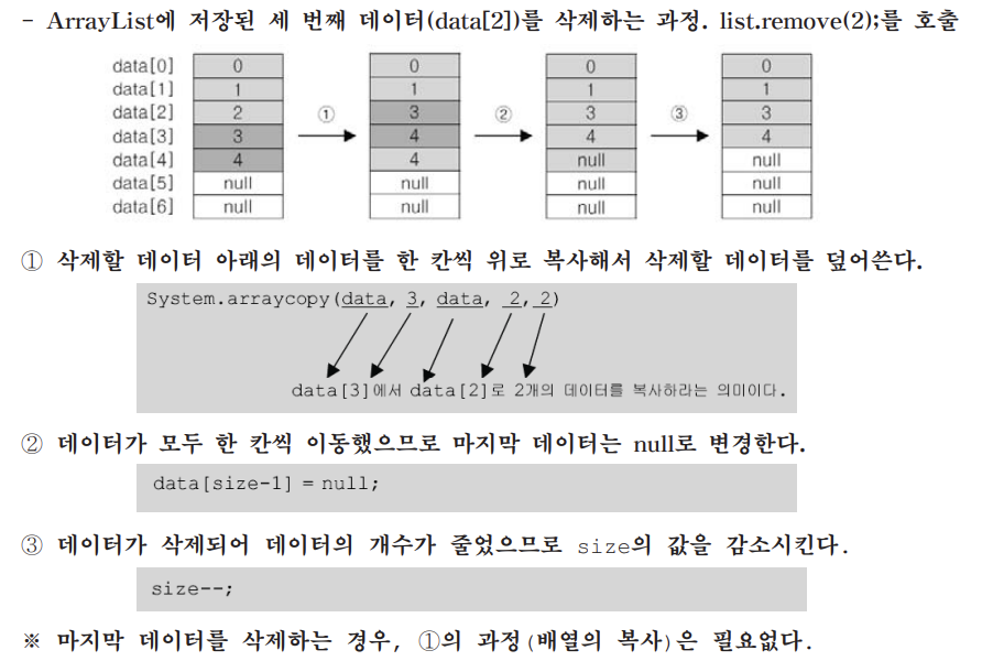 ArrayList의 요소를 삭제하는 경우, 삭제할 객체의 바로 아래에 있는 데이터를 한 칸씩 위로 복사해서 삭제할 객체를 덮어쓰는 방식으로 처리한다.