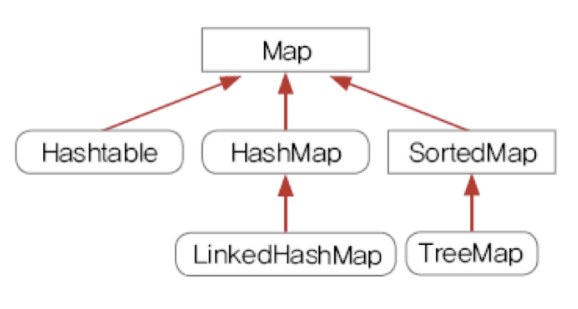 | Map | 키와 값의 쌍으로 이루어진 데이터의 조합, 순서 유지 X 키 : 중복 허용 X 값 : 중복 허용 O 구현 클래스 : HashMap, TreeMap, Hashtable, Properties 등 |