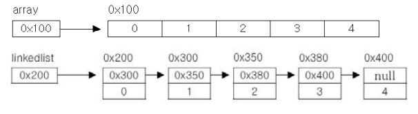 배열은 모든 데이터가 연속적으로 존재하지만, 링크드 리스트는 불연속적으로 존재하는 데이터를 서로 연결(link)한 형태로 구성되어 있다.