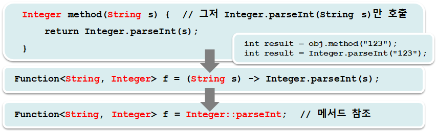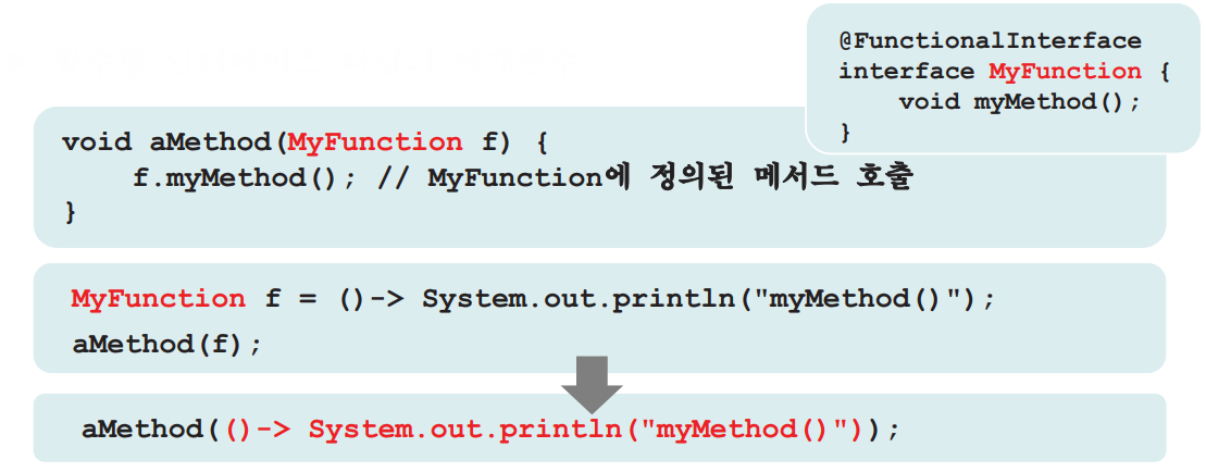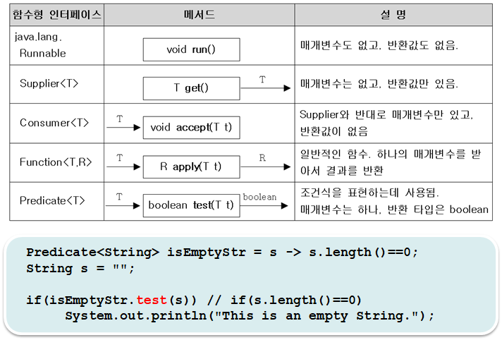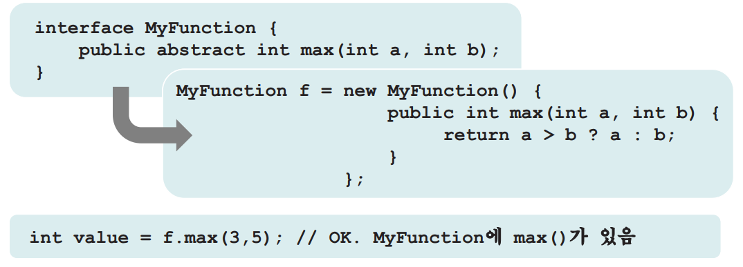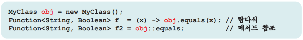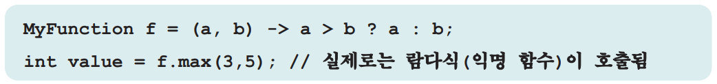 객체의 메서드를 호출하려면 참조 변수가 필요한 것처럼, 람다식(익명 객체)을 다루기 위한 참조변수가 필요하다.