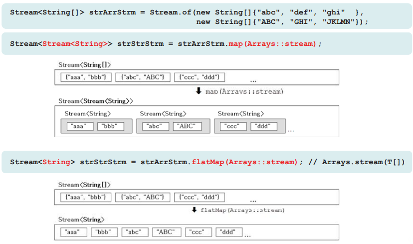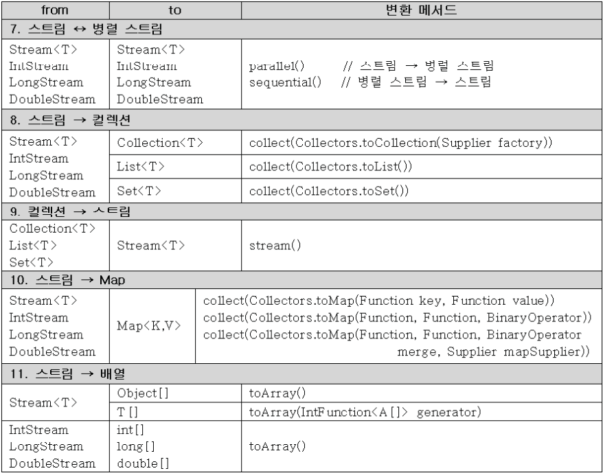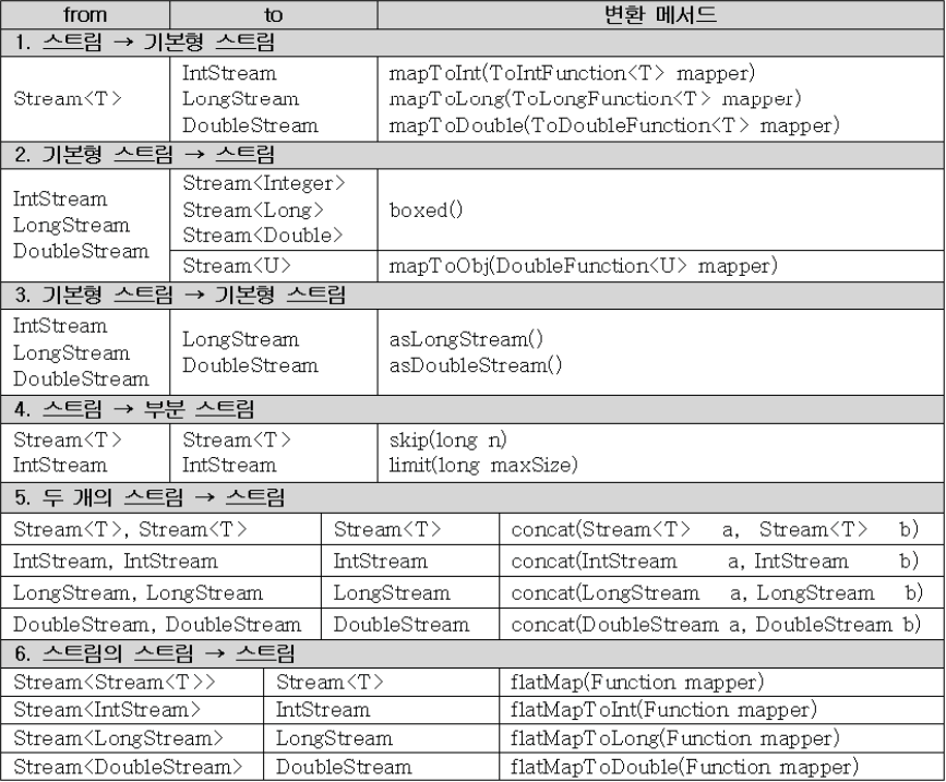 스트림 간의 변환을 찾기 쉽게 정리했다.