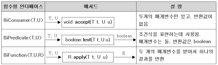 두 개 이상의 매개변수를 갖는 함수형 인터페이스가 필요하다면 아래와 같이 직접 만들어서 써야한다.