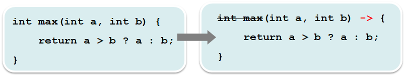 메서드의 이름과 반환타입을 제거하고 '->'를 블록{} 앞에 추가한다.