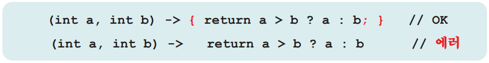 단, 하나뿐인 문장이 return문일 경우 괄호{} 생략 불가