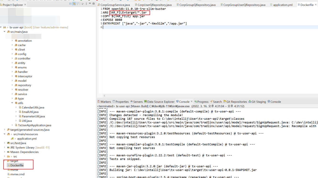 프로젝트의 DockerFile을 Docker로 실행시켜 target에 있는 Jar파일을 가지고 Docker Image로 만든다.