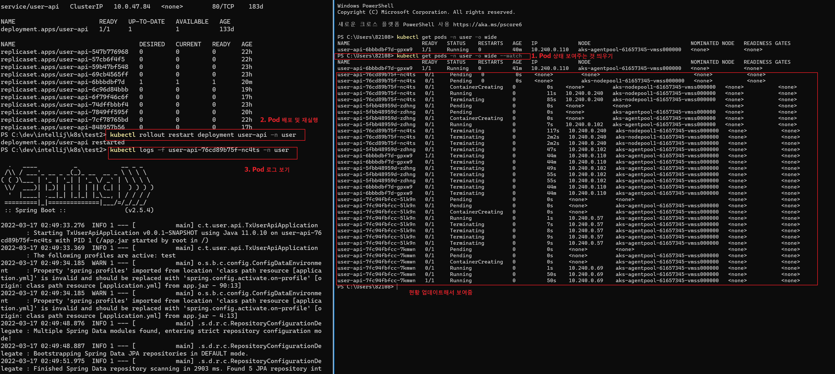 ex) kubectl logs -f user-api-76cd89b75f-nc4ts -n user
