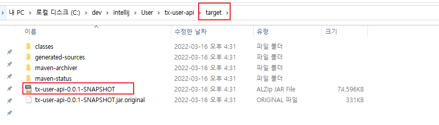 target에 jar파일이 생성된 것을 확인할 수 있다.