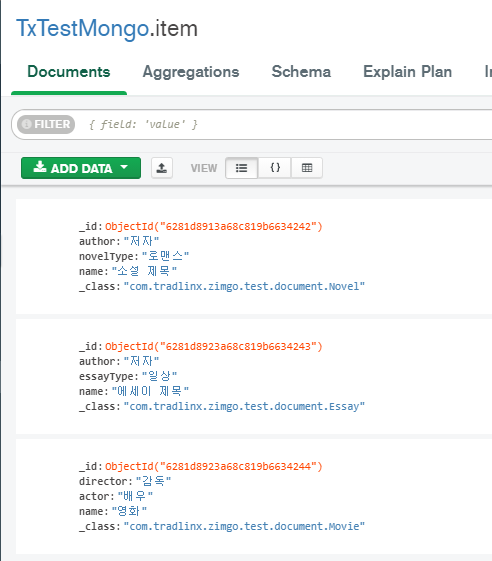 - MongoDB에서 JPA의 상속관계 설정인 @Inheritance, @DiscriminatorColumn, @DiscriminatorValue는 적용되지 않는다.