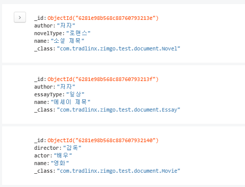 - JAVA로 MongoDB에서 데이터 조회할 때, 자식 클래스 중 어떤 클래스와 매핑할 지 결정하는 것은 Document 내 저장되어 있는 _class이다. _class는 JAVA에서 데이터 저장 시, Document에 자동으로 같이 저장된다.