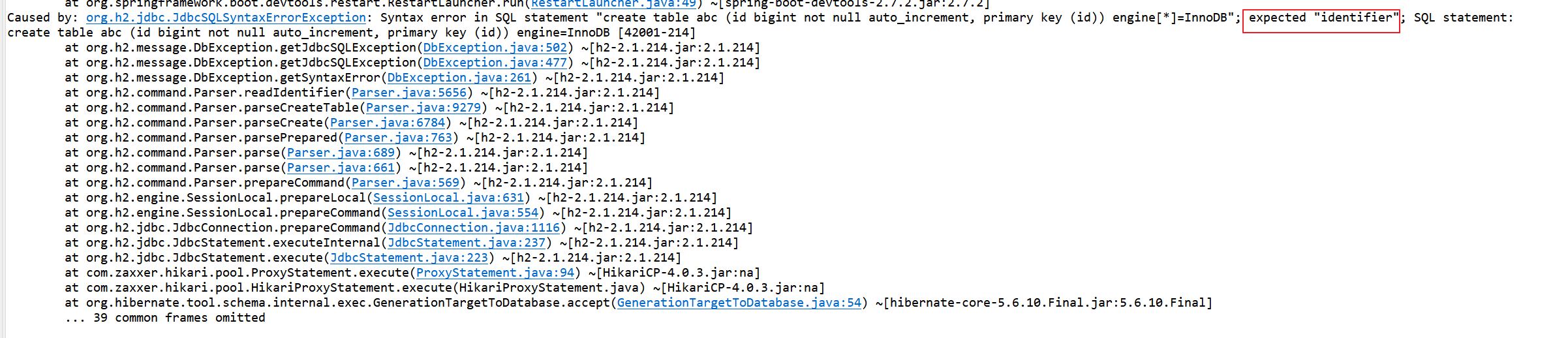 문제 원인은 내가 MySQL을 SQL 문법으로 설정해놓고, datasource의 url에 MODE를 MYSQL이라고 적어주지 않아서 생긴 것이었다. Mode=MYSQL을 추가해주니, 에러 없이 H2 데이터베이스에 테이블이 생성되었다.