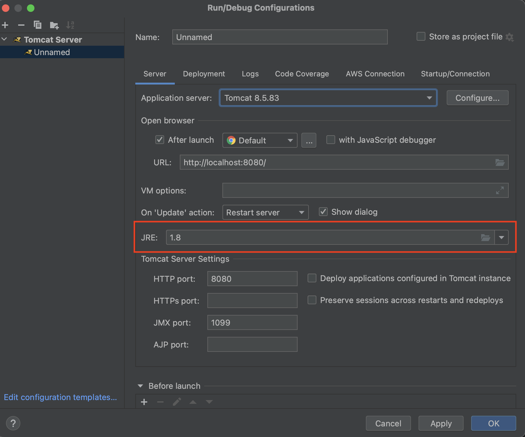 톰캣 서버가 돌아가는 자바 환경인 JRE는 프로젝트의 JAVA 버전과 맞춰준다.