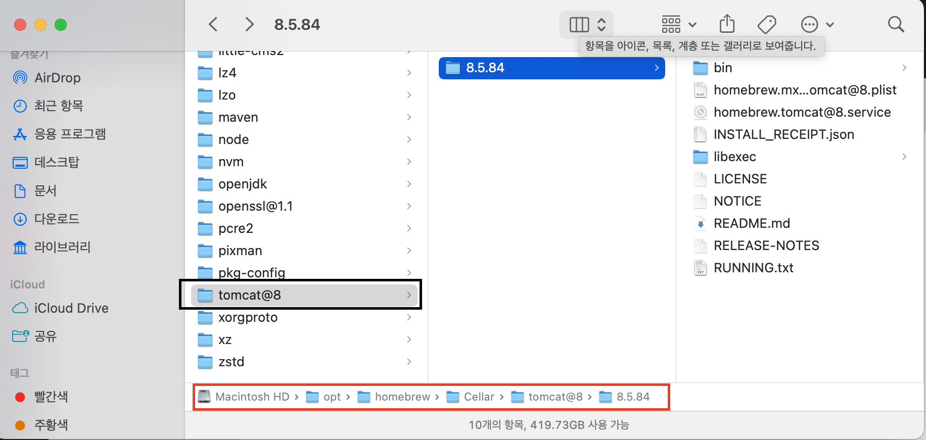 Homebrew를 이용해 Tomcat@8을 설치해줬다.