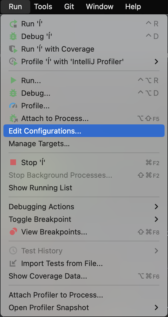 프로젝트의 상단 메뉴에서 Run > Edit Configurations.. 를 누른다.