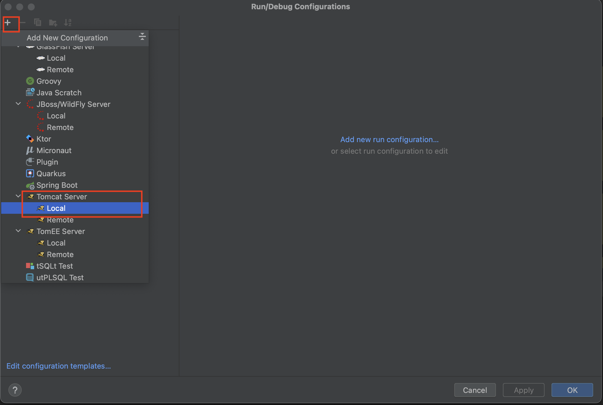 +를 눌러 Tomcat Server의 Local을 선택한다.
