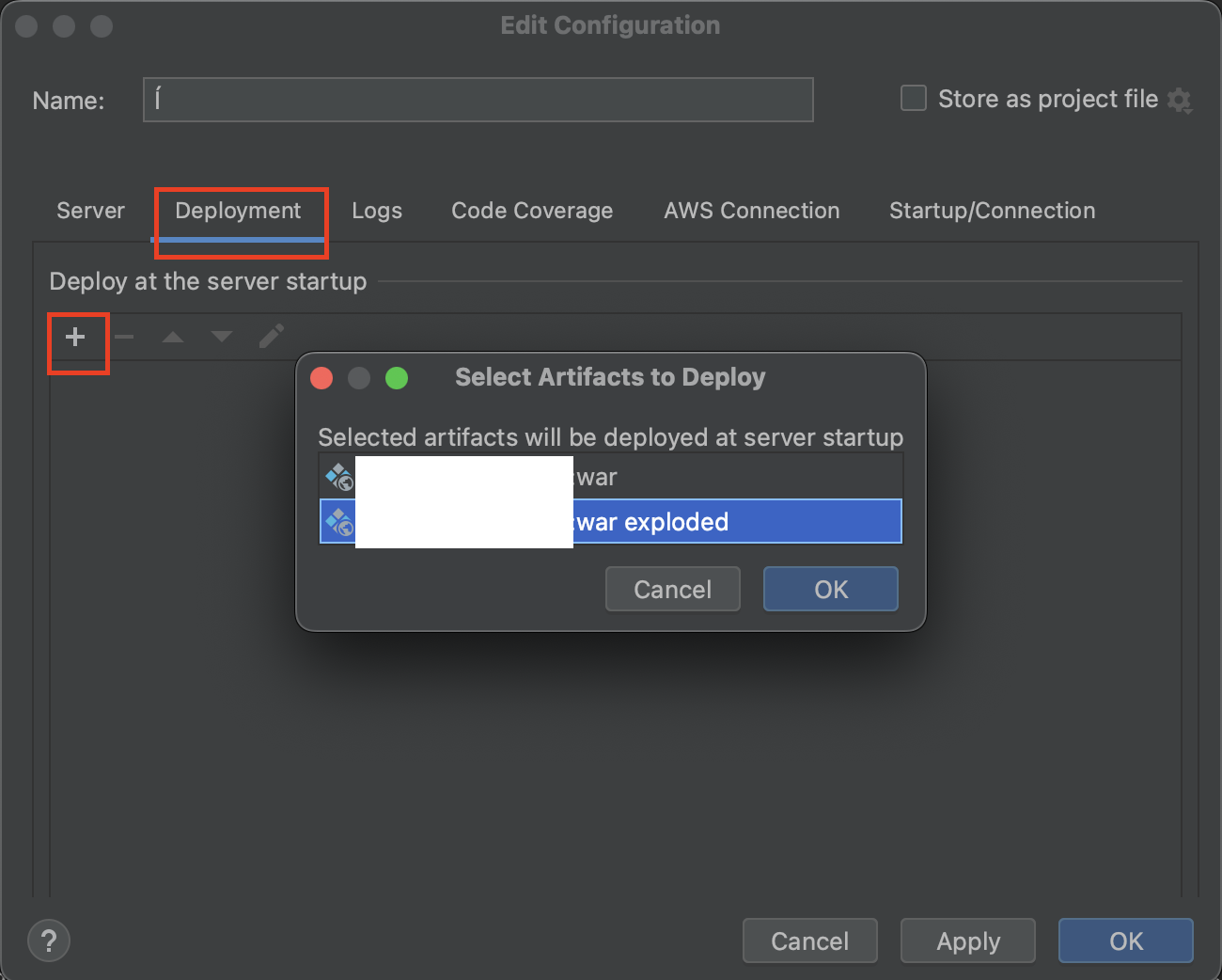 Deployment에서 +의 Artifact를 선택하고 '프로젝트명:war exploded' 를 설정한다.