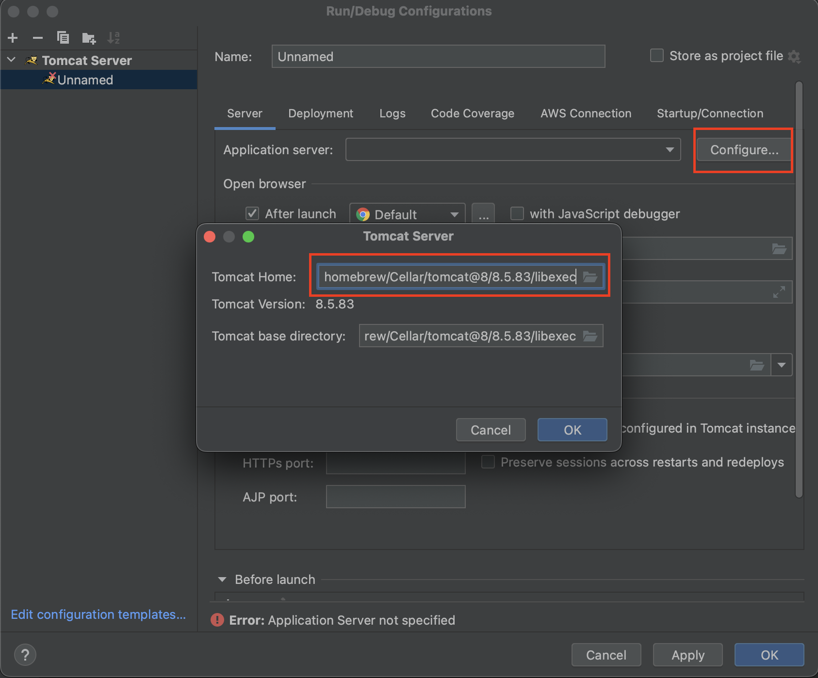 Configure... 를 클릭하고 Tomcat Home을 설치한 Tomcat의 libexec로 경로를 지정해준다.