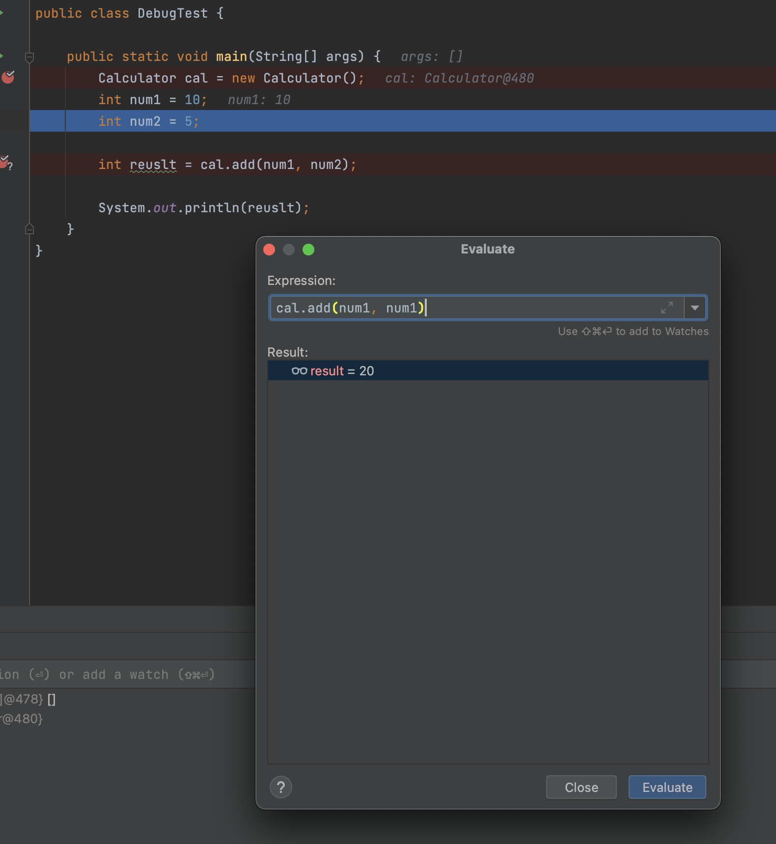 Evaluate를 실행시키면, 아래와 같이 팝업이 나오는데, 여기서 확인하고 싶은 코드를 입력하고 실행시키면 결과를 바로 확인할 수 있다.