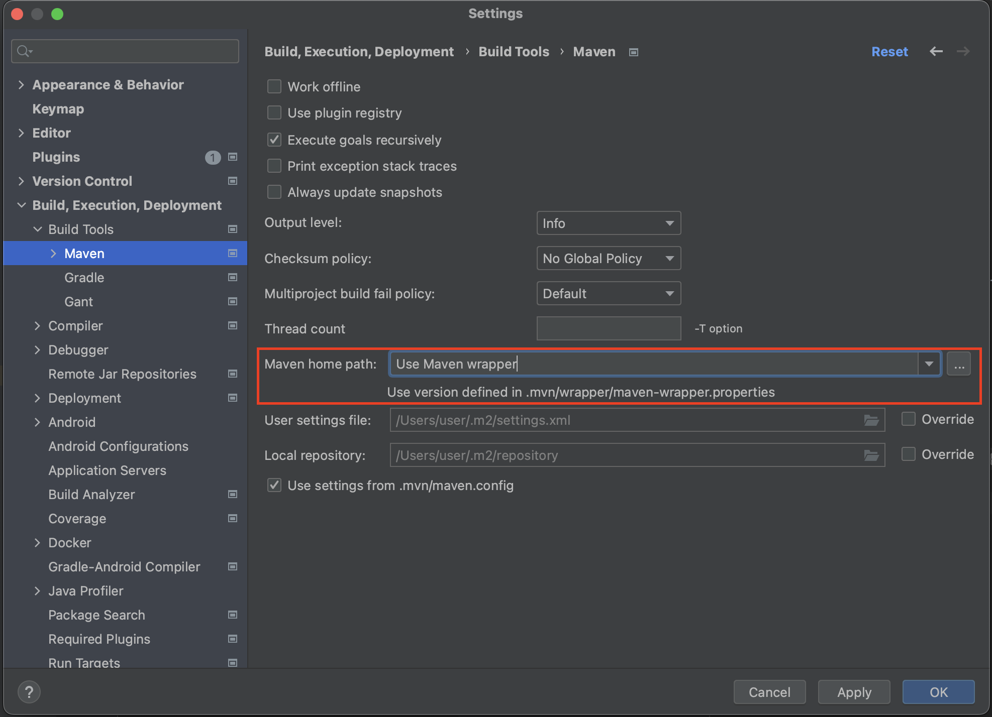 그래서 아래와 같이 IntelliJ의 세팅에서 Build, Execution, Deployment > Maven에 가서 Maven hom path를 Use Maven wrapper로 변경해주었다. 그러고 다시 maven update를 해주니 라이브러리들을 잘 받아왔다.