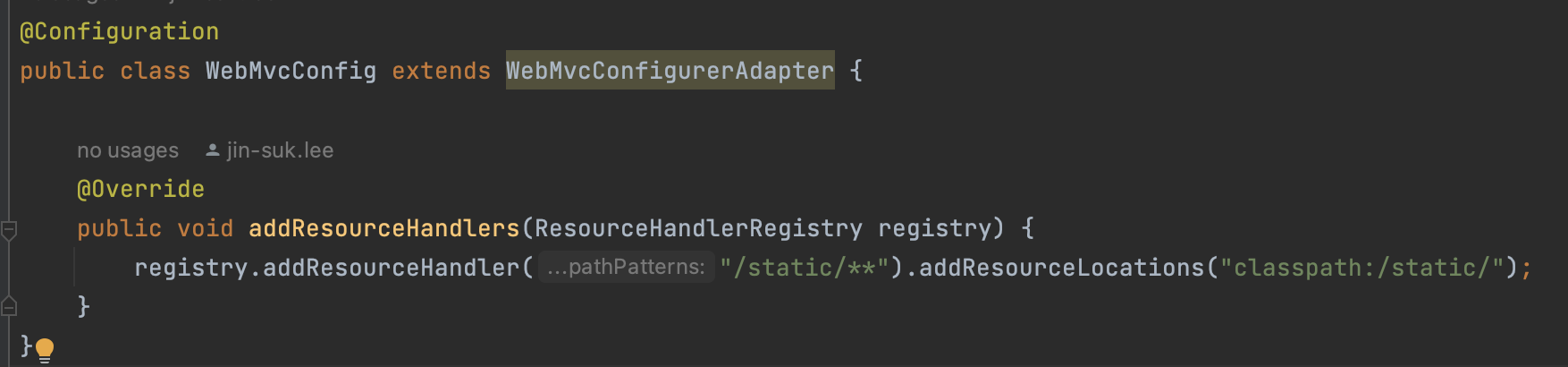 처음에 url 경로 문제인 줄 알았으나, WebMvcConfig.java에서 /static/** 으로 시작하는 url은 classpath:/static/ 디렉토리에서 정적 리소스를 찾는 설정을 확인하였다.