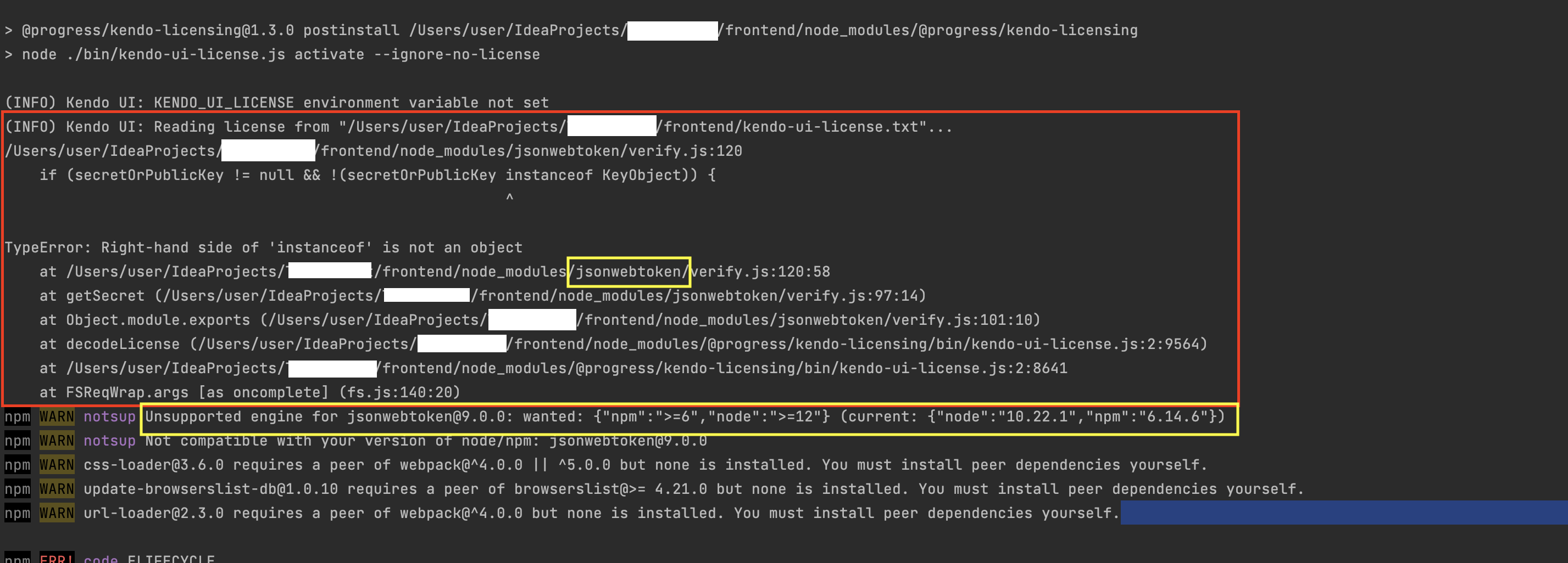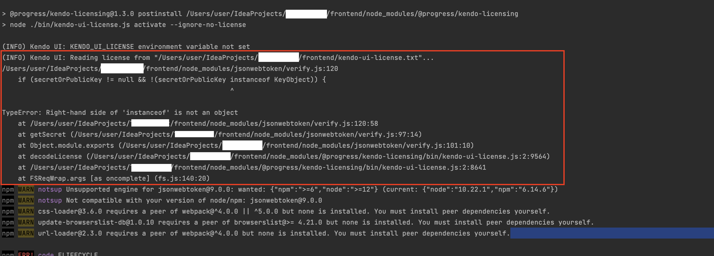 2.4.0으로 올리고 npm install을 실행하니 아래와 같이 @progress/kendo-licensing의 설치가 필요하다는 warning이 나왔다.