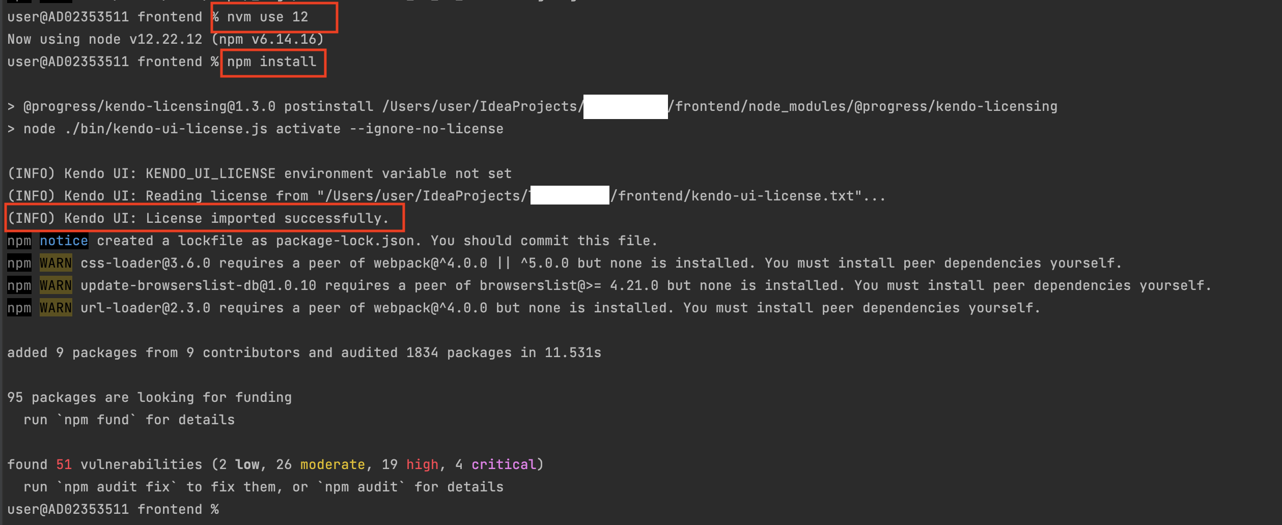 nvm use 12로 node 12버전 사용 후, 다시 npm install. License가 성공적으로 설치된 것을 확인할 수 있다.