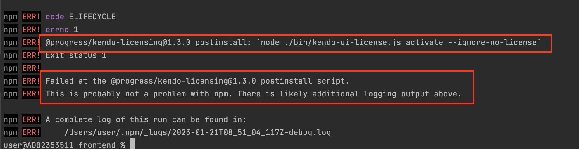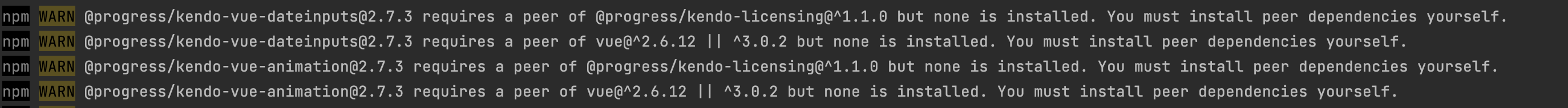 2.4.0으로 올리고 npm install을 실행하니 아래와 같이 @progress/kendo-licensing의 설치가 필요하다는 warning이 나왔다.