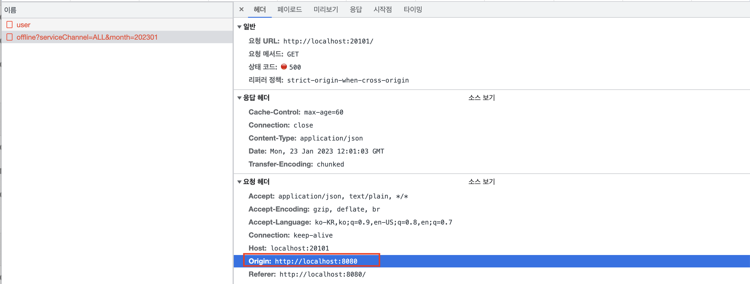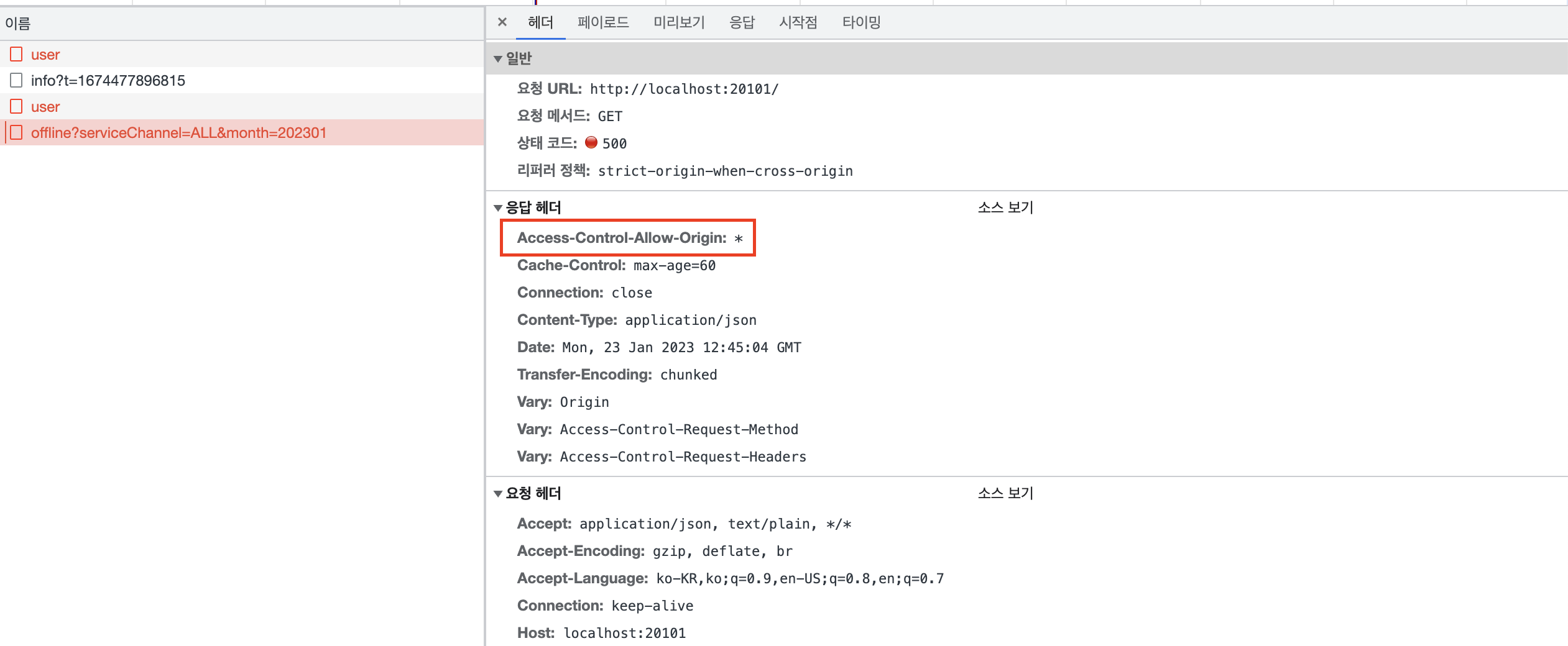 서버에서 응답 헤더에 Access-Control-Allow-Origin 값을 설정해주는 부분이 없으니, 브라우저에서 서버가 보내준 응답 헤더를 보면 Access-Control-Allow-Origin이 보이지 않는다.