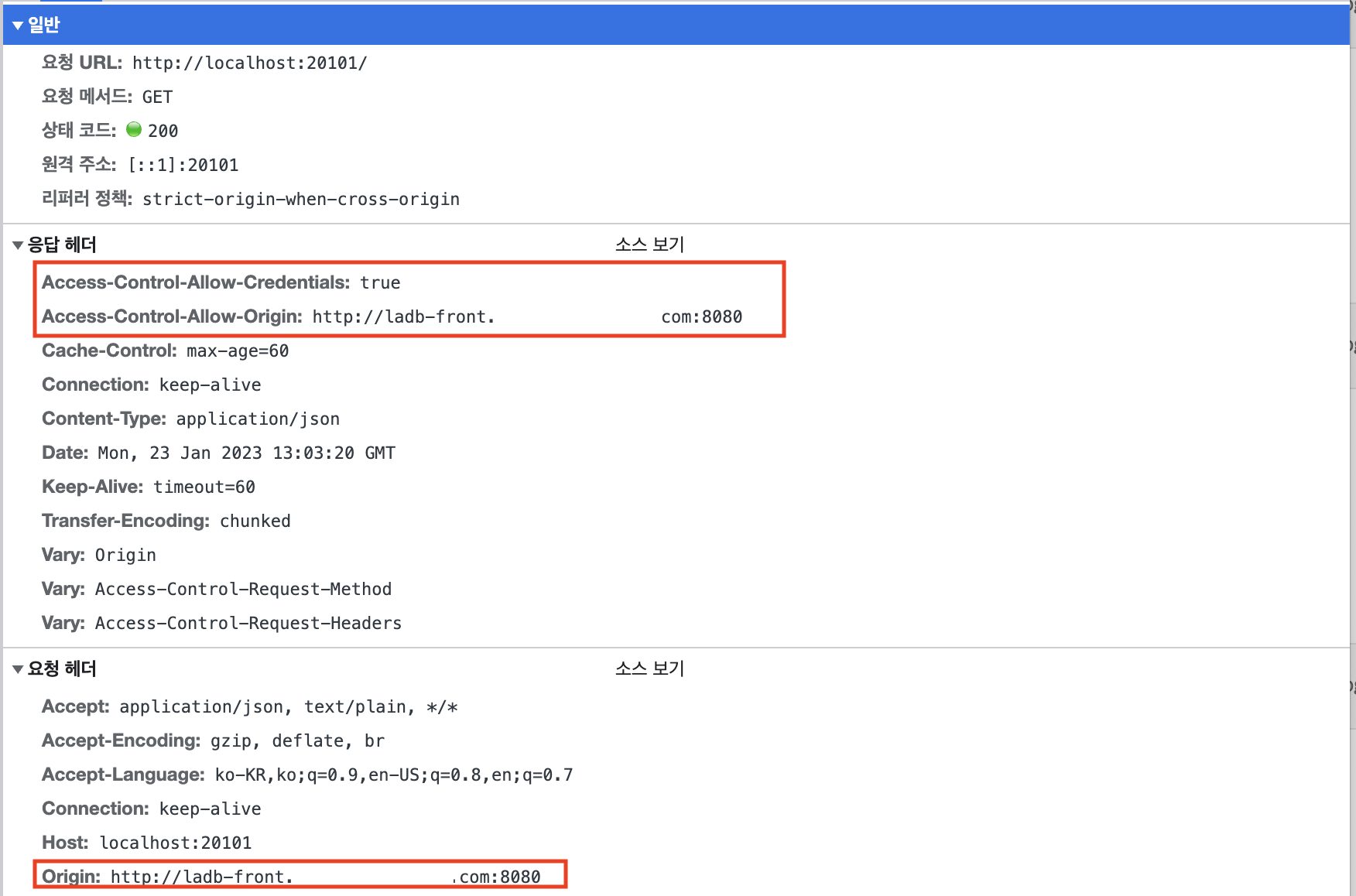 서버의 CORS 설정 변경 후, 브라우저에서 다시 요청을 보내보면 응답 헤더의 Access-Control-Allow-Origin 값이 *에서 요청 헤더의 Origin으로 변경된 것을 확인할 수 있다. 또한, Access-Control-Allow-Credentals 헤더 값이 true로 추가된 것을 확인할 수 있다.