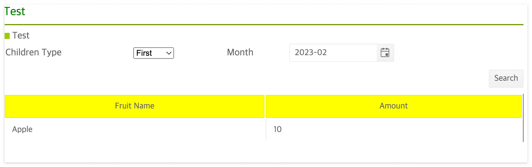 아래와 같이, 검색 조건 부분까지 공통인데, 검색 시 Children Type이 First냐, Second냐에 따라 하단의 테이블이 달라져야 했다.