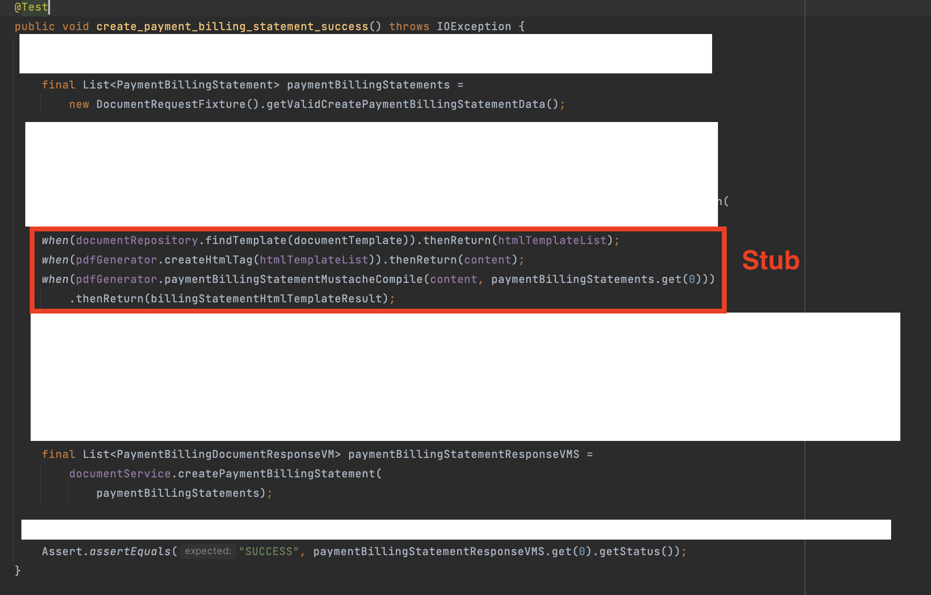 3) Spy객체로 만들기 위해, Mockito.spy() 메서드를 이용해 BillingStatementCreator, BillingStatementDetail, InternalDocumentService 모두 스파이 객체로 만들어줬다.