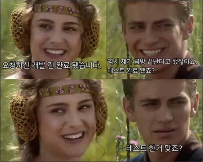 개발유머 테스트 한거 맞죠? MJ.Lee 2022. 2. 8. 09:15 공유하기 게시글 관리 괴발개발 '개발유머' 카테고리의 다른 글 영업팀 vs 개발팀 (0) 2022.04.04 기술 면접 (0) 2022.03.27 포인터 (0) 2022.03.05 버그 막는 나 (0) 2022.02.08 Fullstack (0) 2022.02.08 '개발유머' Related Articles 기술 면접 포인터 버그 막는 나 Fullstack