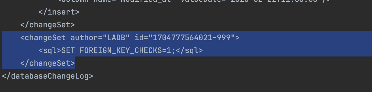 id는 data.xml에서 다른 changeSet에서 사용하고 있는 id를 참조해 맨 앞은 0, 맨 뒤는 999로 하면 된다.