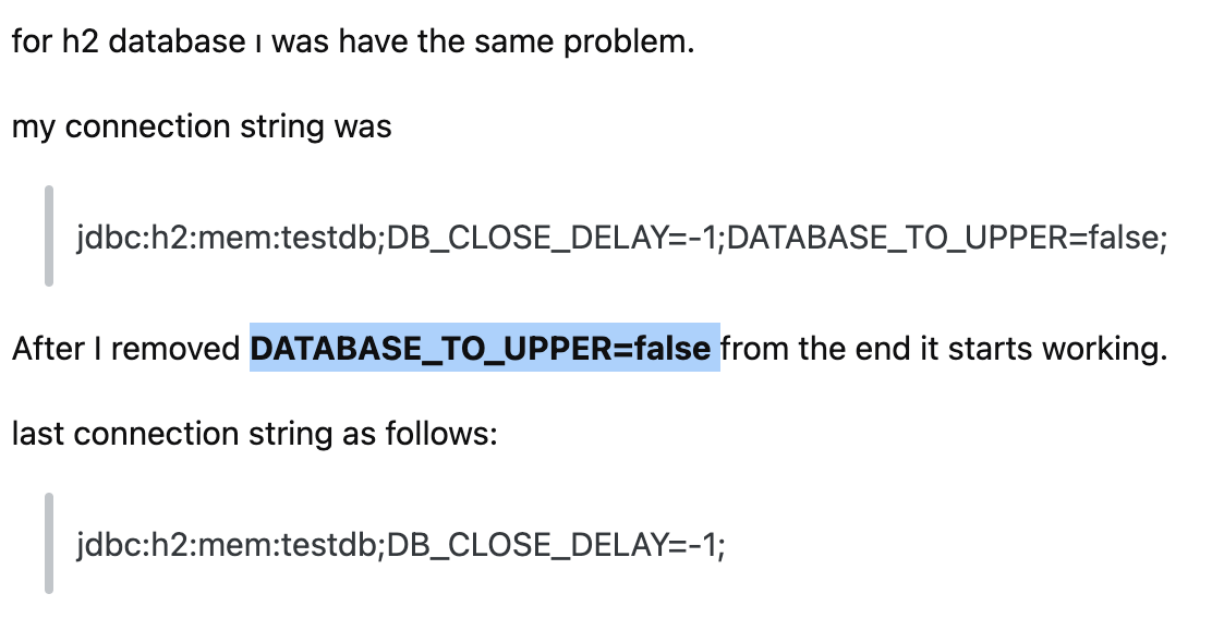 첫 번째 방법: DATABASE_TO_UPPER=false 옵션 제거