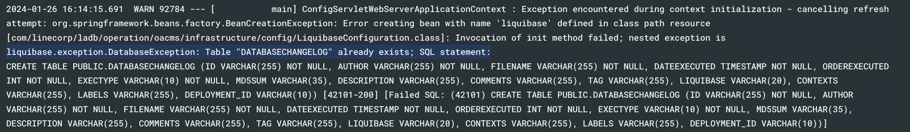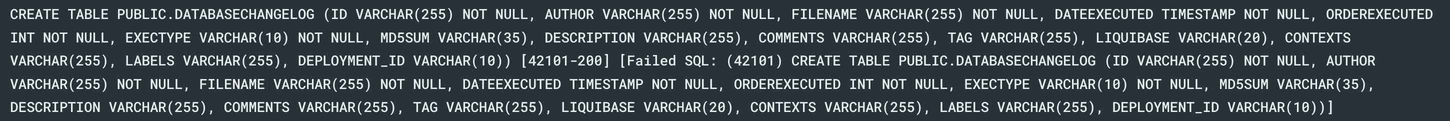 조사할 때 이미 존재했던 DATABASECHANGELOG 테이블을 발견하지 못하고 다시 생성하려 한 것을 알 수 있다.
