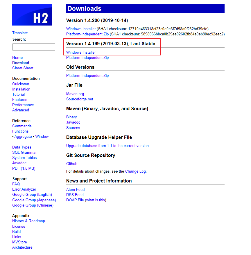 사이트 주소: http://www.h2database.com/html/download.html