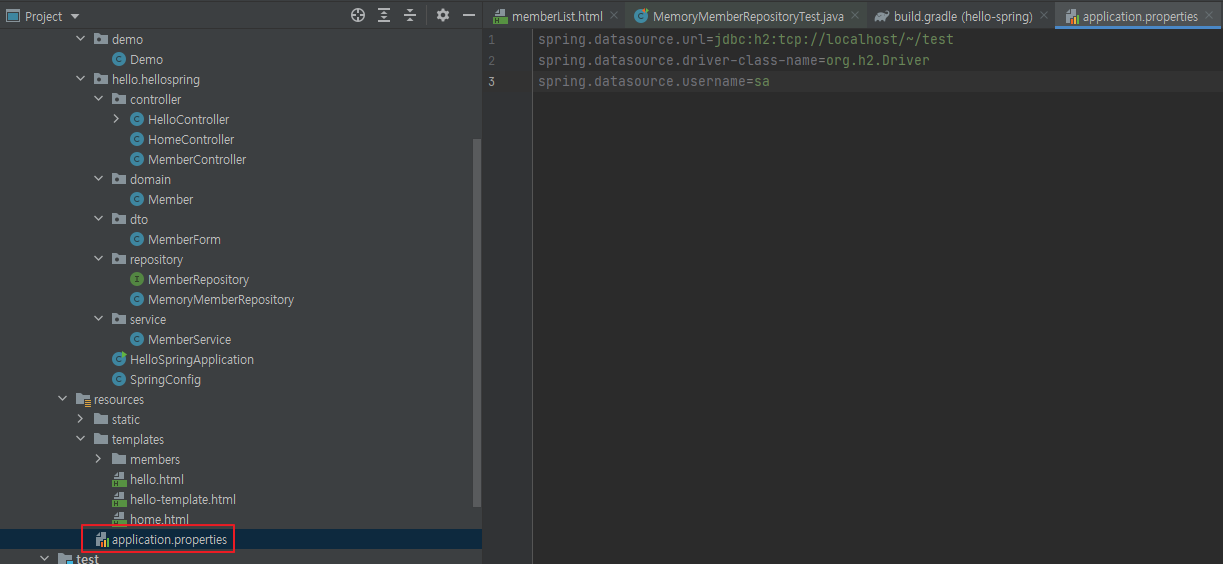- application.properties에 H2 url, driver-class-name, username을 작성