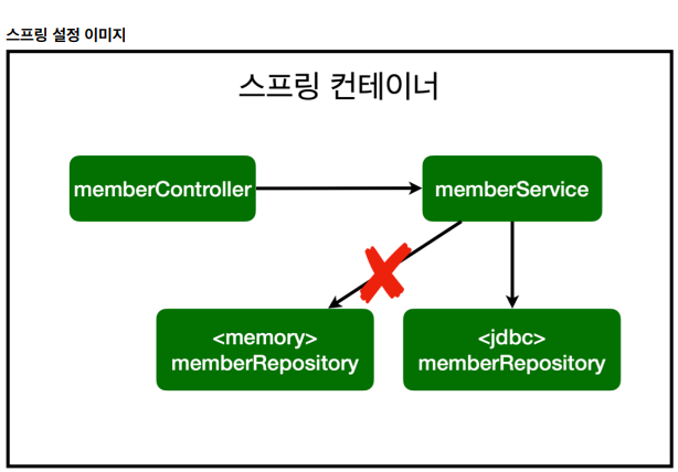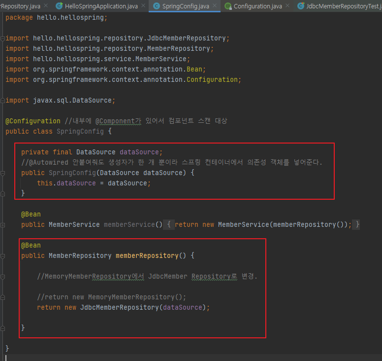 - memberService의 memberRepository를 MemoryRepository에서 JdbcMemberRepository로 변경