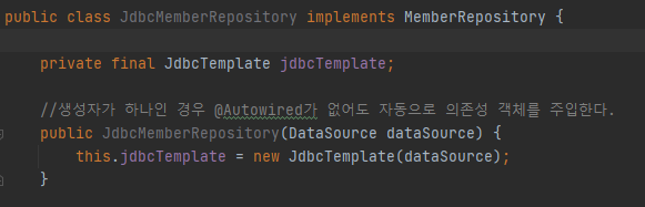 스프링 부트는 데이터베이스 커넥션 정보를 바탕으로 DataSource를 생성하고 스프링 빈으로 만들어둔다. 그래서 DI를 받을 수 있다 - 생성자가 하나인 경우 @Autowired를 안붙여도 자동으로 의존성 객체가 주입된다.