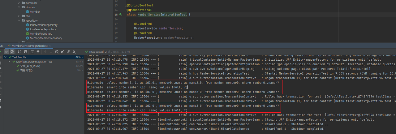 - @Transactional: 테스트 케이스에 이 애노테이션이 있으면, 테스트 시작 전에 트랜잭션을 시작하고, 테스트 완료 후에 항상 롤백한다. 이렇게 하면 DB에 데이터가 남지 않으므로 다음 테스트에 영향을 주지 않는다.