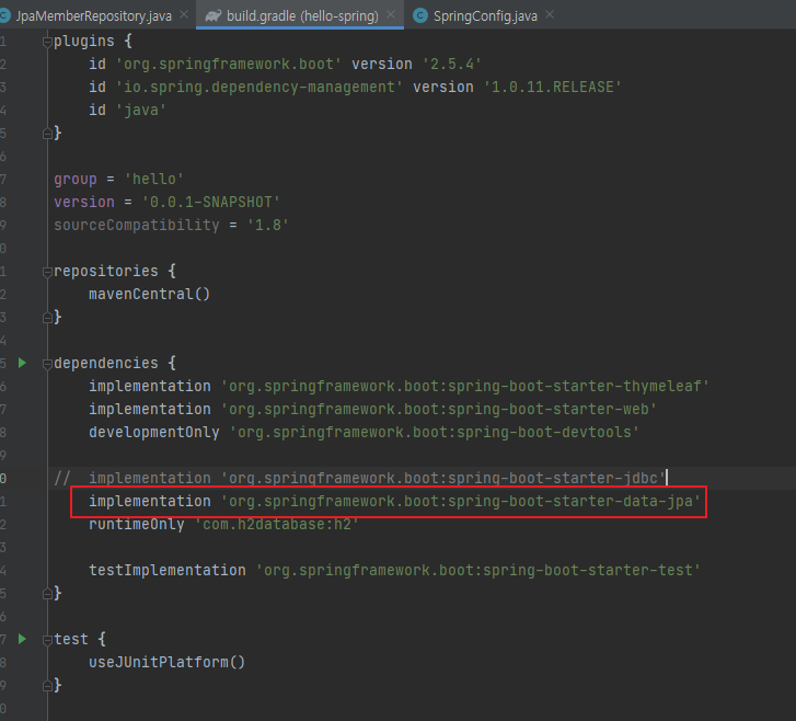 build.gradle 파일에 JPA 관련 라이브러리 추가