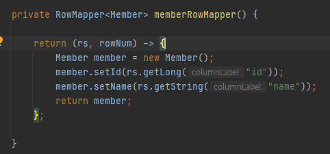 - memberRowMapper() 메서드는 아래와 같이 람다식으로 변경할 수 있다.