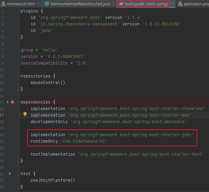- build.gradle의 dependencies에 jdbc와 H2 관련 라이브러리 추가.