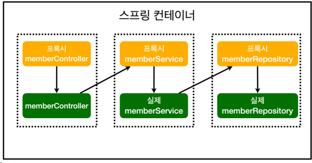 스프링 컨테이너에서 프록시를 이용해 가짜 memberService를 만든다.