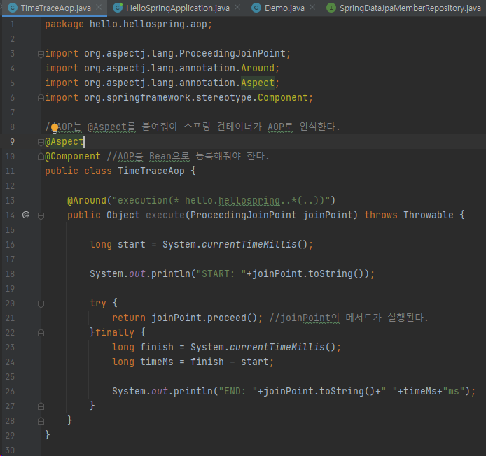 Ex) execution( hello.hellospring..(..))는 hello.hellospring 패키지 내부 메소드 모두 적용 - jointPoint.proceed()는 AOP 적용 대상의 메소드를 실행시킨다.