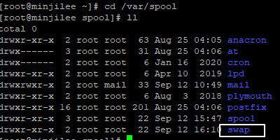 그 후, cd /var/spool 로 spool directory에 들어간 후 ll 명령어로 파일 목록을 확인했다.