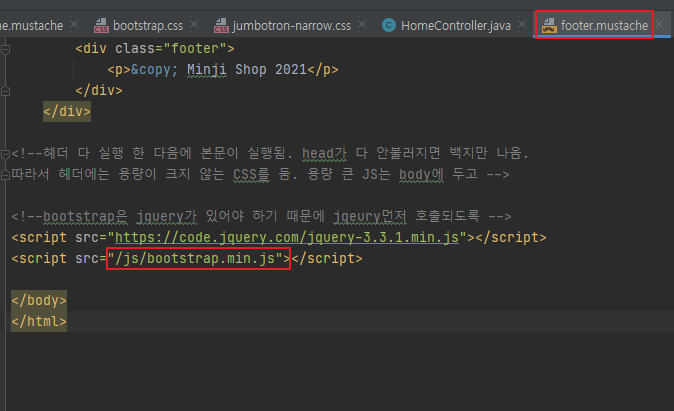 home.mustache를 기준으로 layout/header와 layout/footer를 가지고 옵니다.