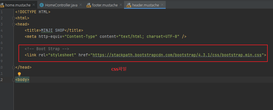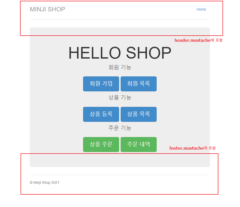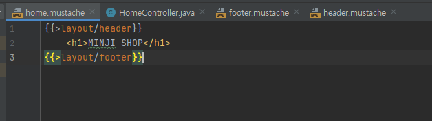 아래와 같이 home.mustache를 구성하기 위해, header와 footer mustache 파일을 수정했다.