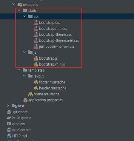 정적 파일을 관리하는 static에 css와 js 폴더를 추가하고, 필요한 css와 js파일들을 집어넣는다.